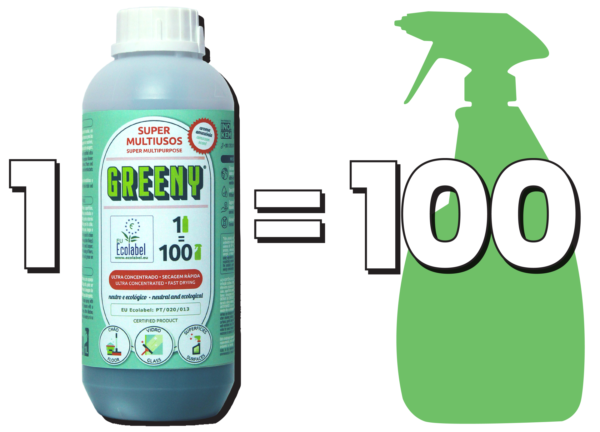 Para além desta prestigiada distinção de sustentabilidade, este produto é ultra concentrado, sendo que 1 litro pode ser diluído em 100 litros de água, transformando-o no produto pronto a usar, num pulverizador, por exemplo. Desta forma, uma garrafa de GREENY poupa 100 garafas plásticas.